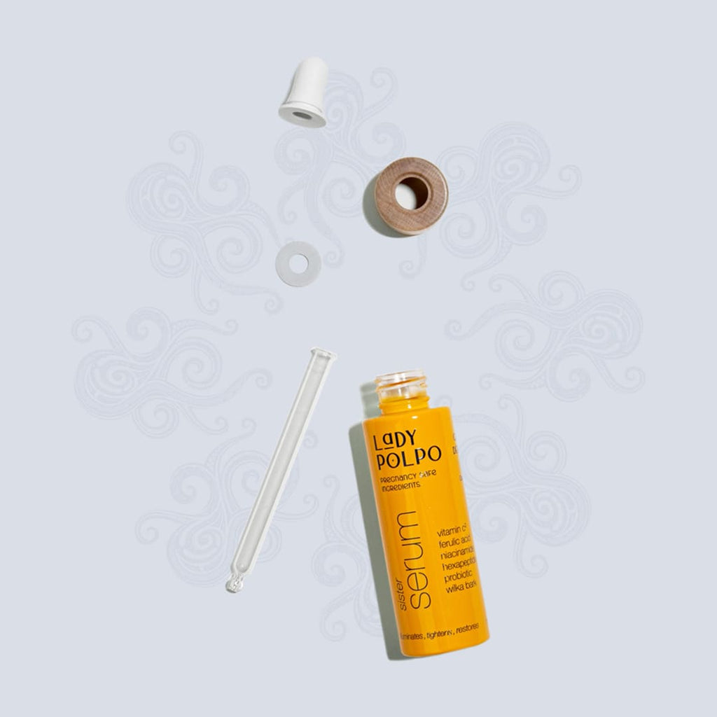 Our multi-tasking Sister Serum unlocks radiant skin with the perfect union of ingredients, including 2 forms of potent vitamin c, ferulic acid, niacinamide, probiotic, hexapeptide, and wilka bark. Designed by a dermatologist mama, this powerhouse ingredient combination effectively brightens and tightens your skin while remaining gentle and safe for pregnant mamas.